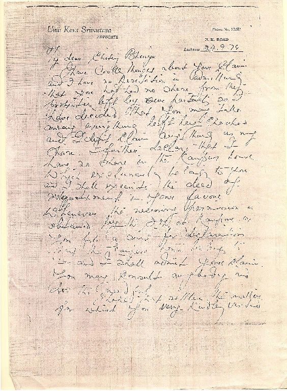When babu Rama Kant got tired, frustrated and fed up with his older brother, Babu Uma Kant, he stormed into his office and demanded that he do the partition of the estate left by Babu Shyam Manohar ASAP. Rama Kant was concerned that in the past Babu Uma Kant sold all the properties left by their parents, and never gave anything to him (Rama Kant). Think about it, never gave anything to him ! to his cute little younger brother, not even ice cream ? may be some ice cream - we don't know. In this hand written letter below, Uma Kant confesses to Rama Kant that that indeed is true. Also in this letter dated September 24, 1974 Babu Uma Kant, makes no reference of the "will" being peddled around supposedly written in 1971. In this letter, Babu Uma Kant agrees to give everything to his younger brother including the Lucknow house and the Kanpur house as compensation for taking everything from his childhood. A total mea culpa. He also makes no mention of the fictitious properties mentioned in the alleged will since they were fictitious after all. If he was giving away everything why miss those properties ?